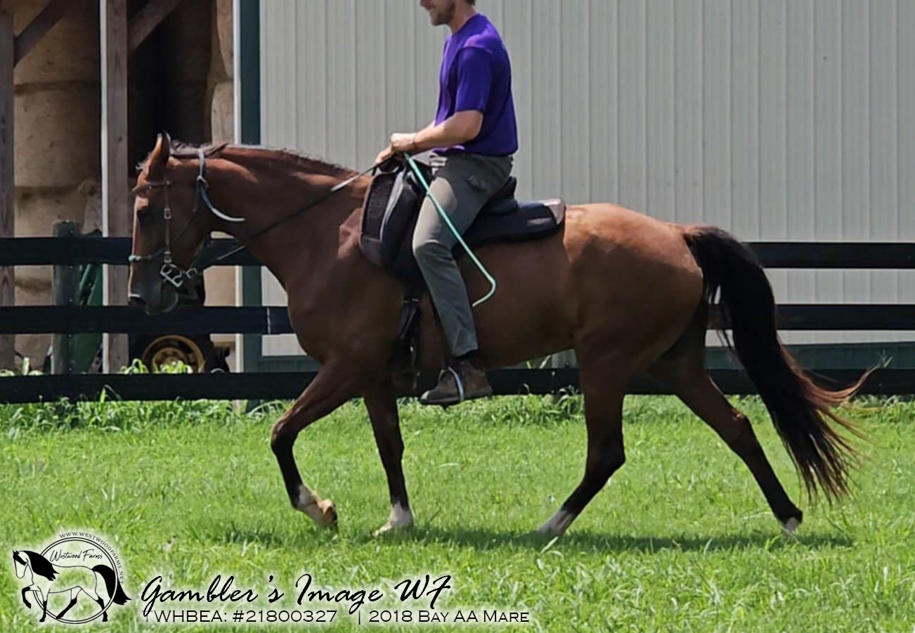 Image's sire is Golden Gambler, one of the best horses I've ever had the pleasure to ride. Gambler's bloodlines are a unique blend of the western working bloodlines through his sire, Blue Gold (who goes back to Roy Roger's own "Trigger Jr." aka Allen's Gold Zephyr), and the old eastern show lines through his dam, Cindy's Image-GH. Image was known for her true walking horse gaits and lovely disposition. Her sire was by Ebony Masterpiece and dam by Triple Threat. I chose Gambler's Image WF for her name as an homage to her granddam, Cindy's Image GH.