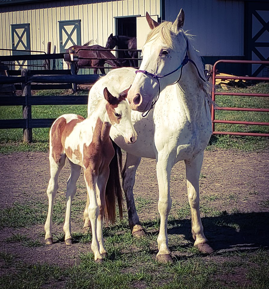 a sabino foal. Bred to tobiano stallions, she produces wildly marked
